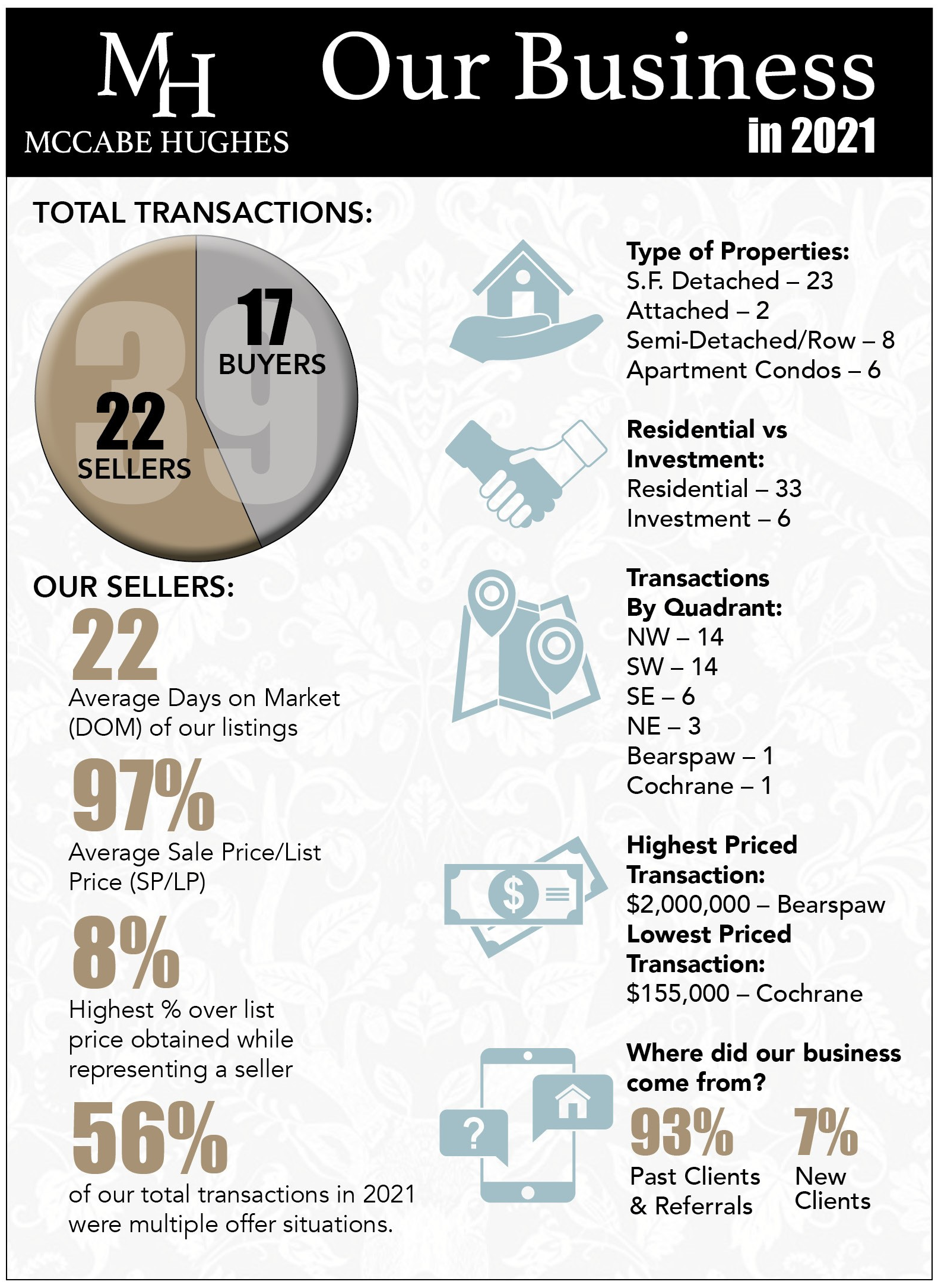 It came as no surprise that the majority of our transactions last year were residential sales, and mostly single family detached homes. Most transactions were conducted in the NW and SW areas, although we successfully conducted business all over the city and beyond.